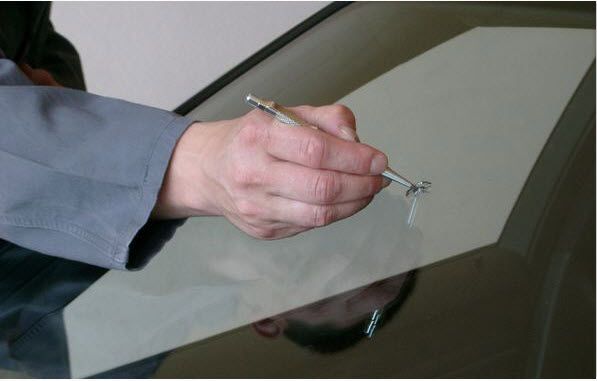 1 - Avec le stylo à pointe carbure, enlevez les morceaux de verre qui peuvent être dans l'impact sans agrandir le trou.