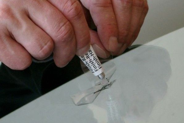 9 - Enlevez le porte injecteur et posez un morceau de film écran délicatement et sans appuyer sur l'impact. Relevez légèrement le film, mettez une goutte de résine de finition sur l'impact et reposez le film sur le verre.